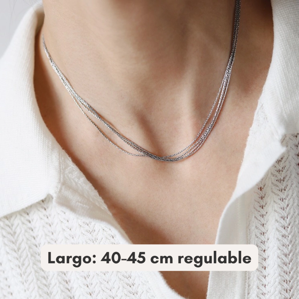 Este collar de acero quirúrgico plateado está compuesto por cuatro cadenitas finas unidas, creando un efecto multicapa delicado y moderno que realza cualquier look. Su diseño es liviano, versátil y atemporal, perfecto para usar solo o combinar con otros collares.